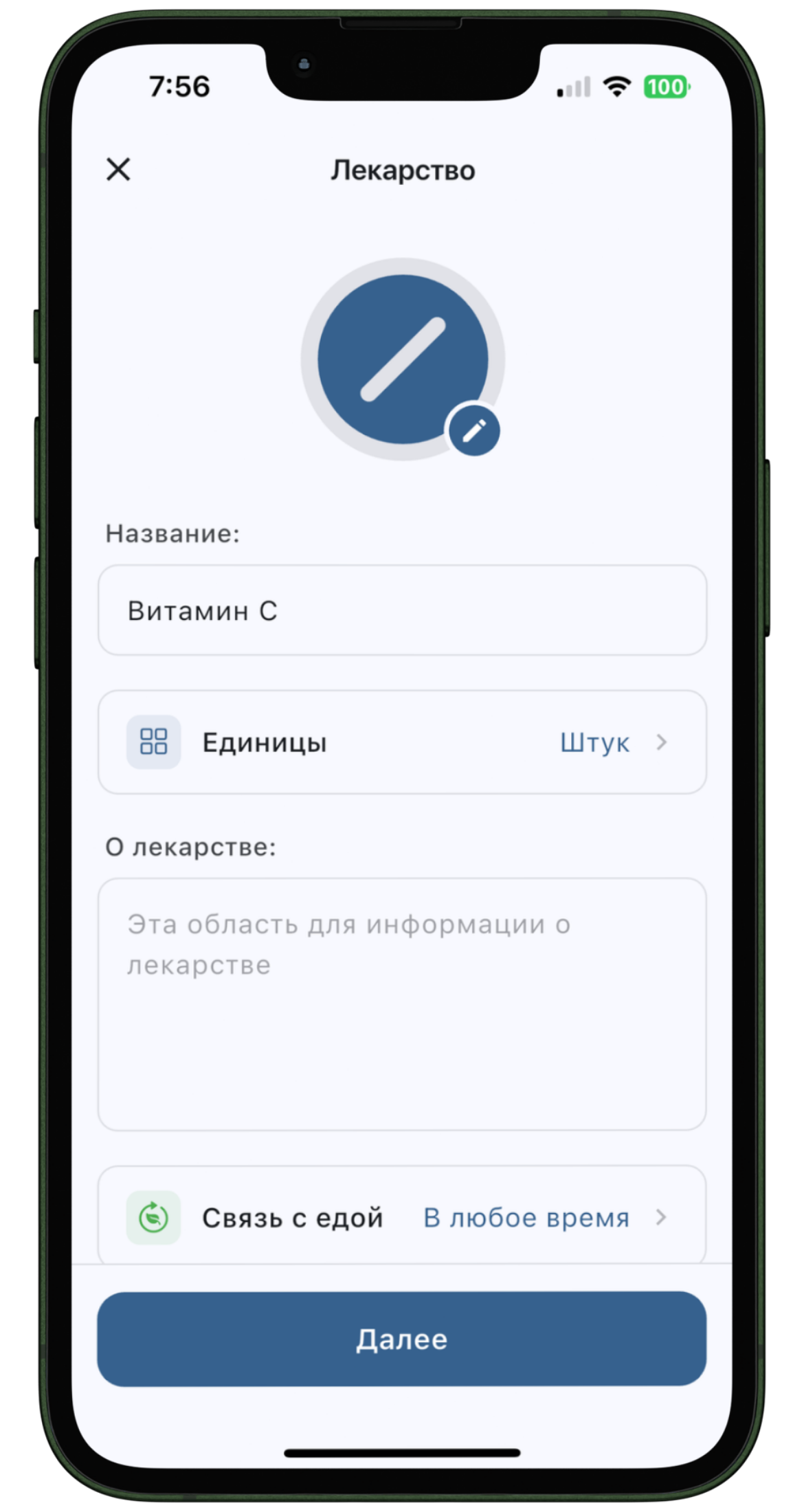 Единицы (шт, мг, мл, г), связь с приёмом пищи (до/во время/после еды) и заметки