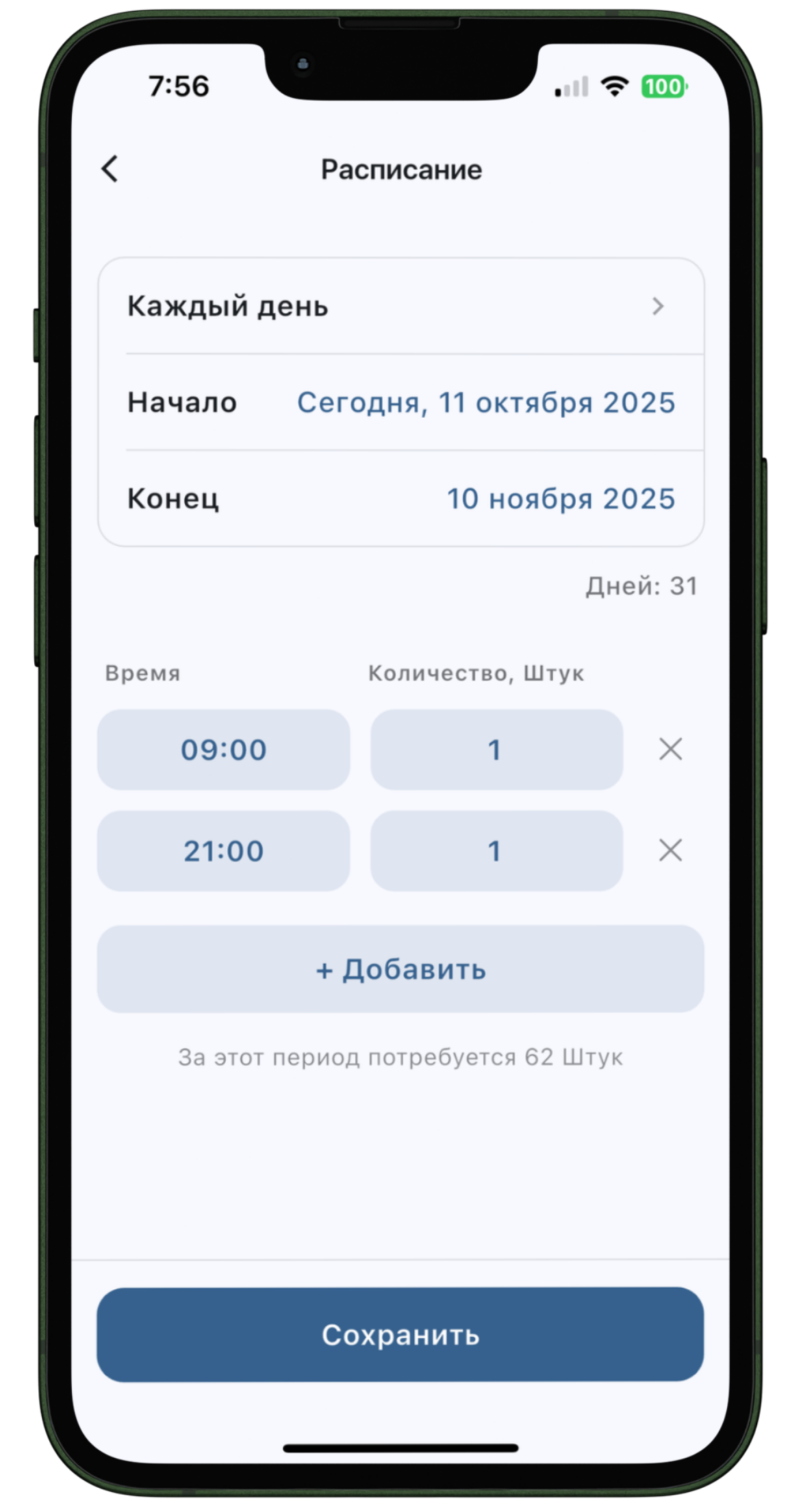 Ежедневно, еженедельно, через X дней, по конкретным дням или циклами приёма-пропуска