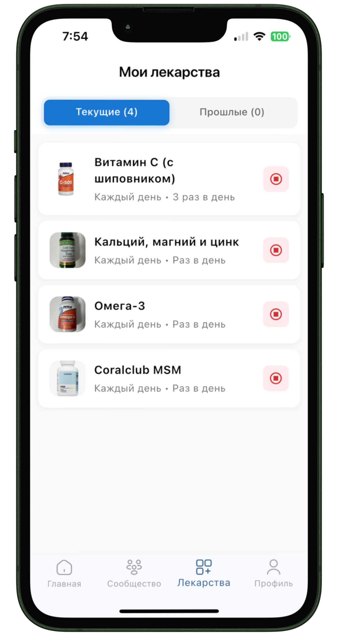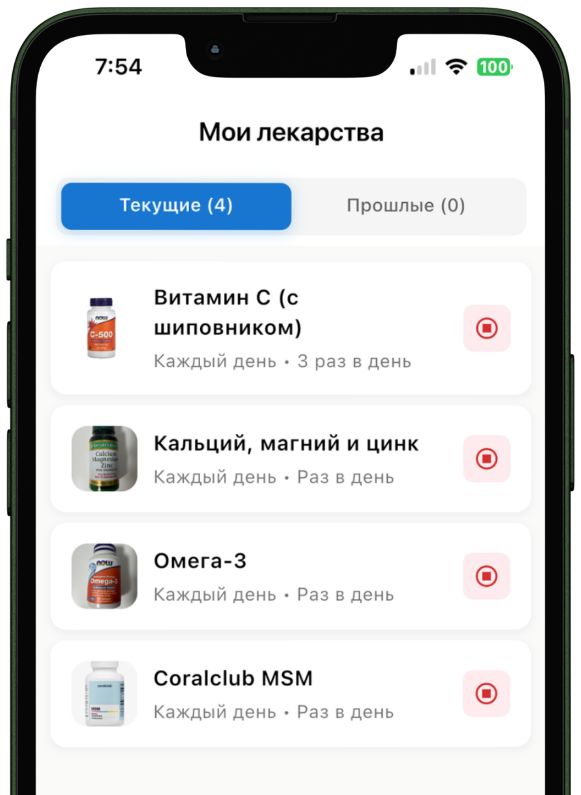 Интуитивно понятный дизайн, который помогает легко управлять вашими лекарствами и следить за графиком приёма.